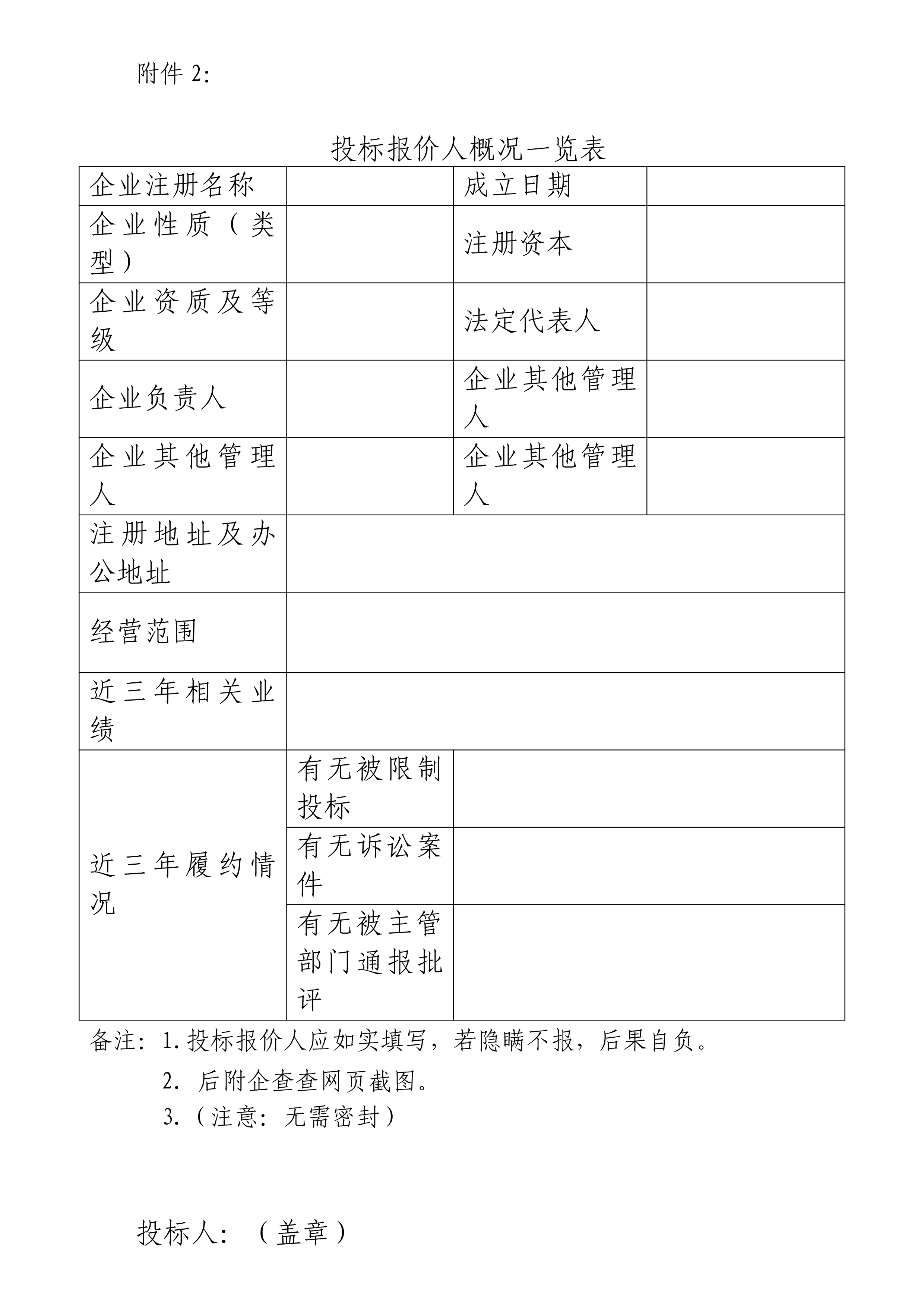 3.投标代理人递交投标文件时应携带企业营业执照、身份证复印件、投标报价人概况一览表(详见附件2)、企查查截图,并加盖公章。以上无需密封,递交投标文件时须进行资格预审,未通过资格预审的视为无效表述。